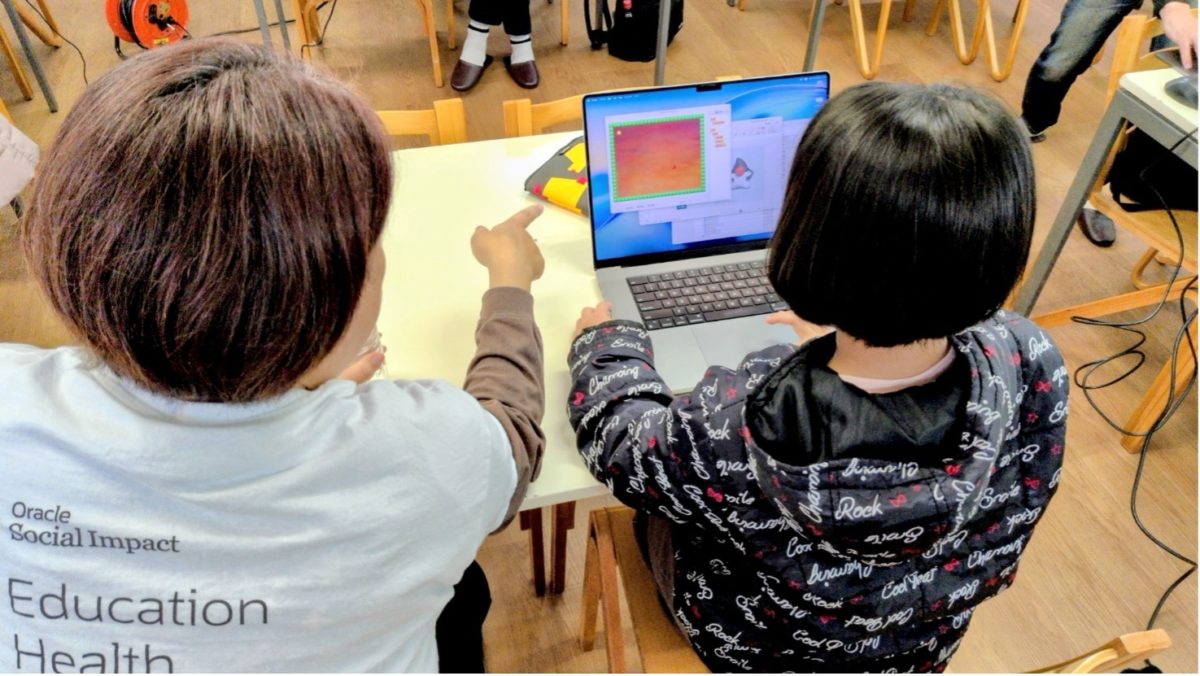 「もっとゲームで遊びたい!」という声も上がる中、オリジナルゲーム作成に向けてプログラミングをスタート。子どもと社員がペアになって、学びを進めていきます。プログラミングデータは英語で書かれていますが、社員のみなさまが子どもたちのペースに合わせて丁寧に教えてくれます。初めは戸惑っていた子どもたちも、プログラミングの仕組みを理解すると、自分たちでどんどんプログラミングを進めていきます。