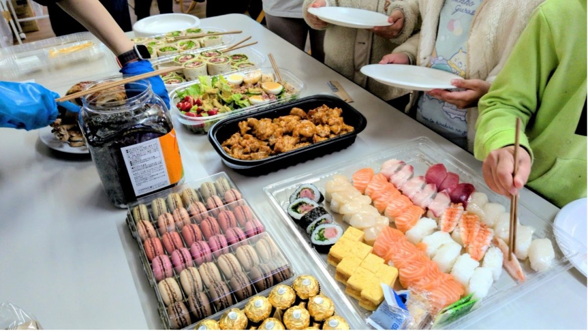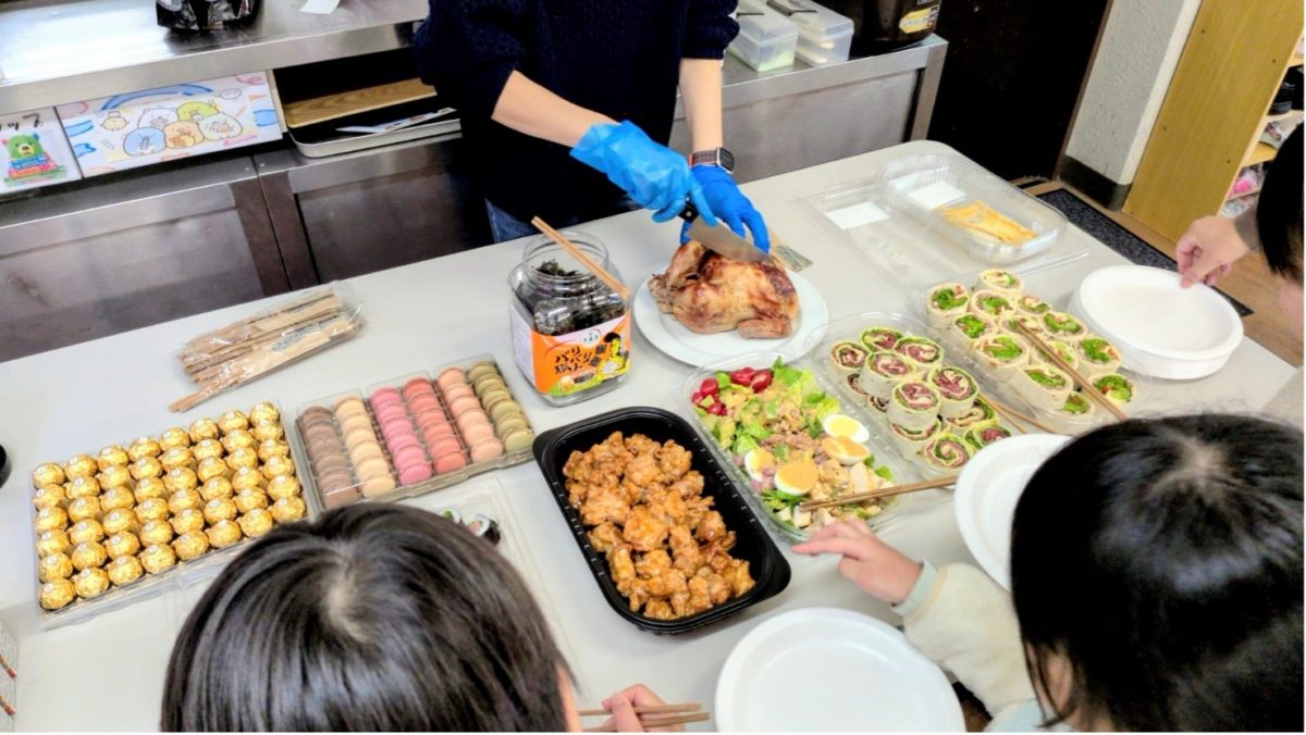 社員のみなさまがコストコで買ってきてくれた豪華なご飯がテーブルいっぱいに並びました。普段食卓に並ばない食事に子どもたちは喜んでくれました。