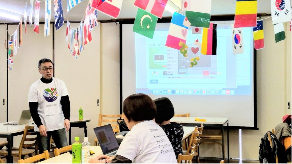 施設内の国旗が飾られた素敵な食堂を会場にしてセミナーを開始。今日は「BobbySnake」というヘビのゲームを、プログラミングを学びながらオリジナルゲームへ作り変えていきます。