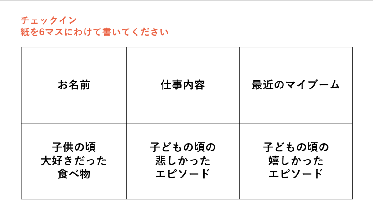 同じ会社の中でも、普段あまり関わることのない社員同士が集まるなか、まずはお互いを知っていくことで、空気をあたためていきます。