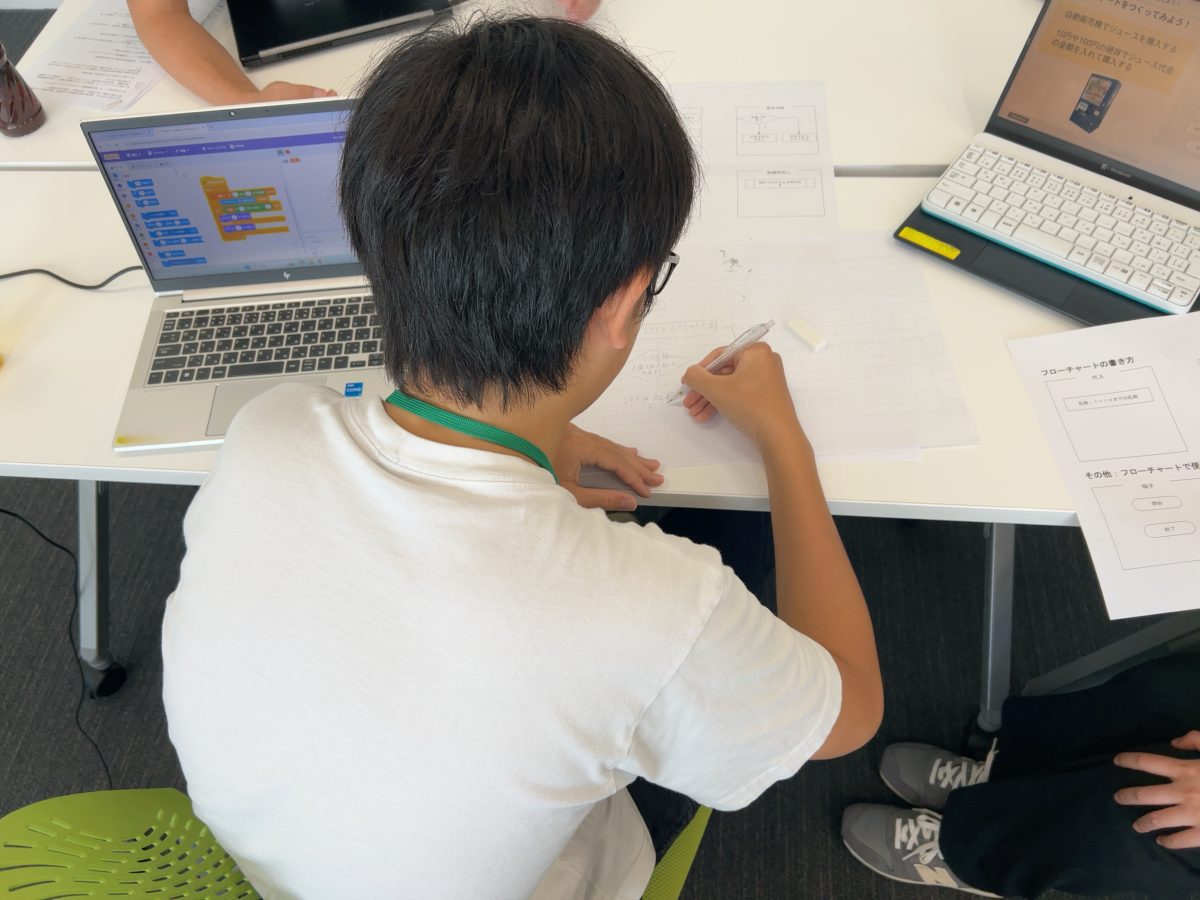 続いて、プログラム設計の重要な考え方、フローチャートの基礎を学びます。実際に、自動販売機を題材にフローチャートを作る課題に取り組みました。