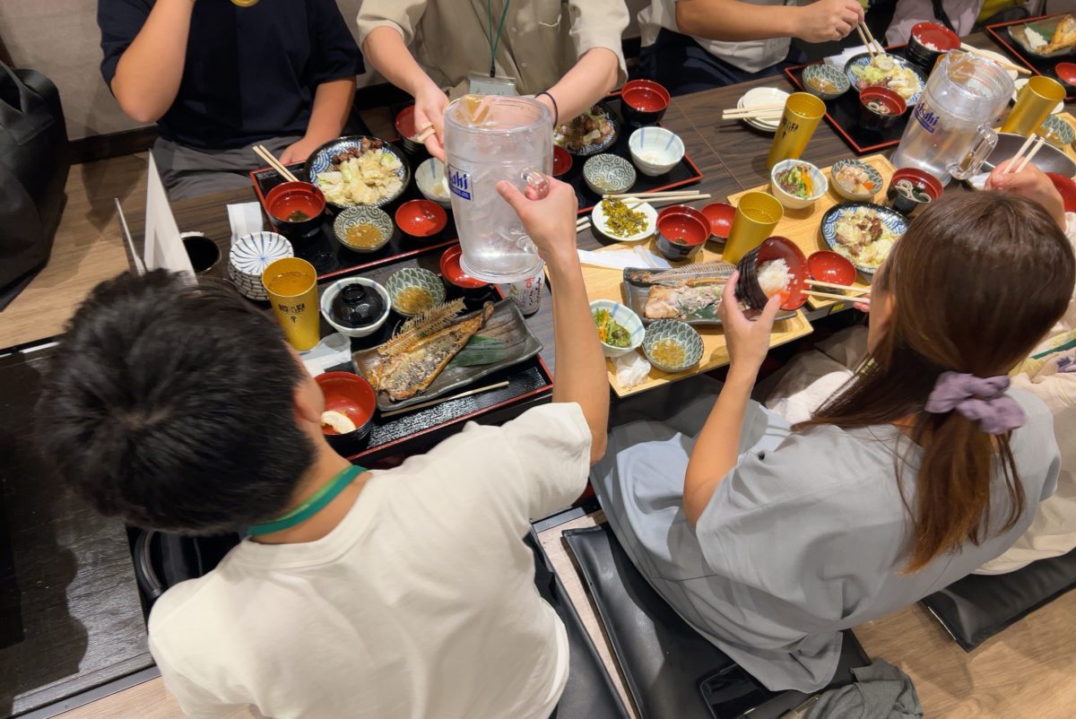 難しい課題に頭が疲れた頃、お待ちかねのランチタイム。焼肉や焼き魚など、子どもたちの大好きなメニューが並ぶレストランへ。子どもたちはオフィス街での外食という非日常にワクワクドキドキしていましたが、美味しいご飯でお腹が満たされて気持ちがほぐれたのか、社員さんとの会話がはずみました。