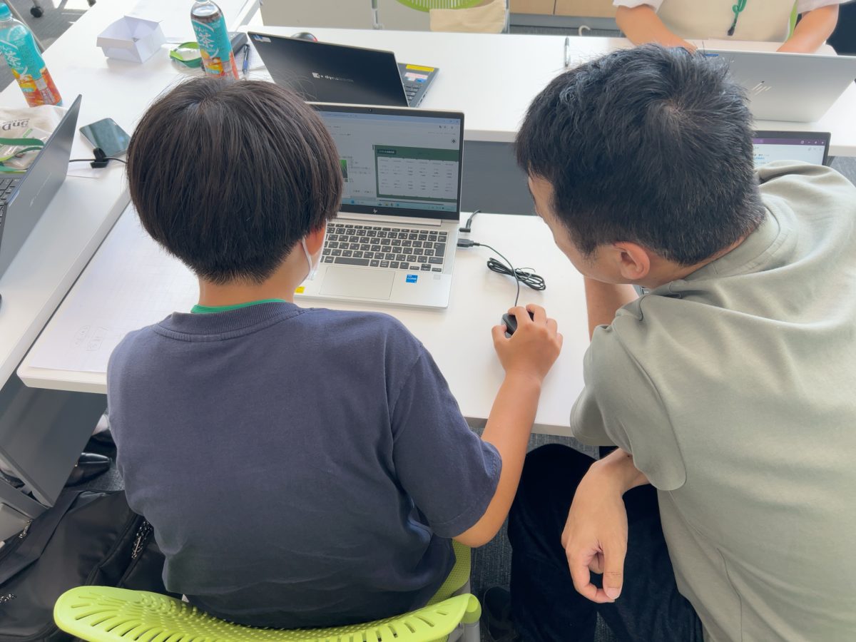 続いて、お待ちかねのプログラミング体験。午前中に作成したシフト表を自動作成できるプログラムを作ります。プログラミング方法を教えて頂き取り組みますが、初体験のことに子どもたちは苦戦。