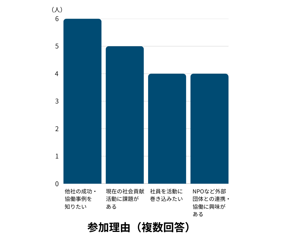 事後アンケートでは、「若手社員をボランティア活動を通じて育てられるという、企業側メリットのロジックが参考になった。」「社会貢献を可視化するという興味深いテーマでのご実施ありがとうございました。大変勉強になりました。」など、嬉しい感想をいただきました。
